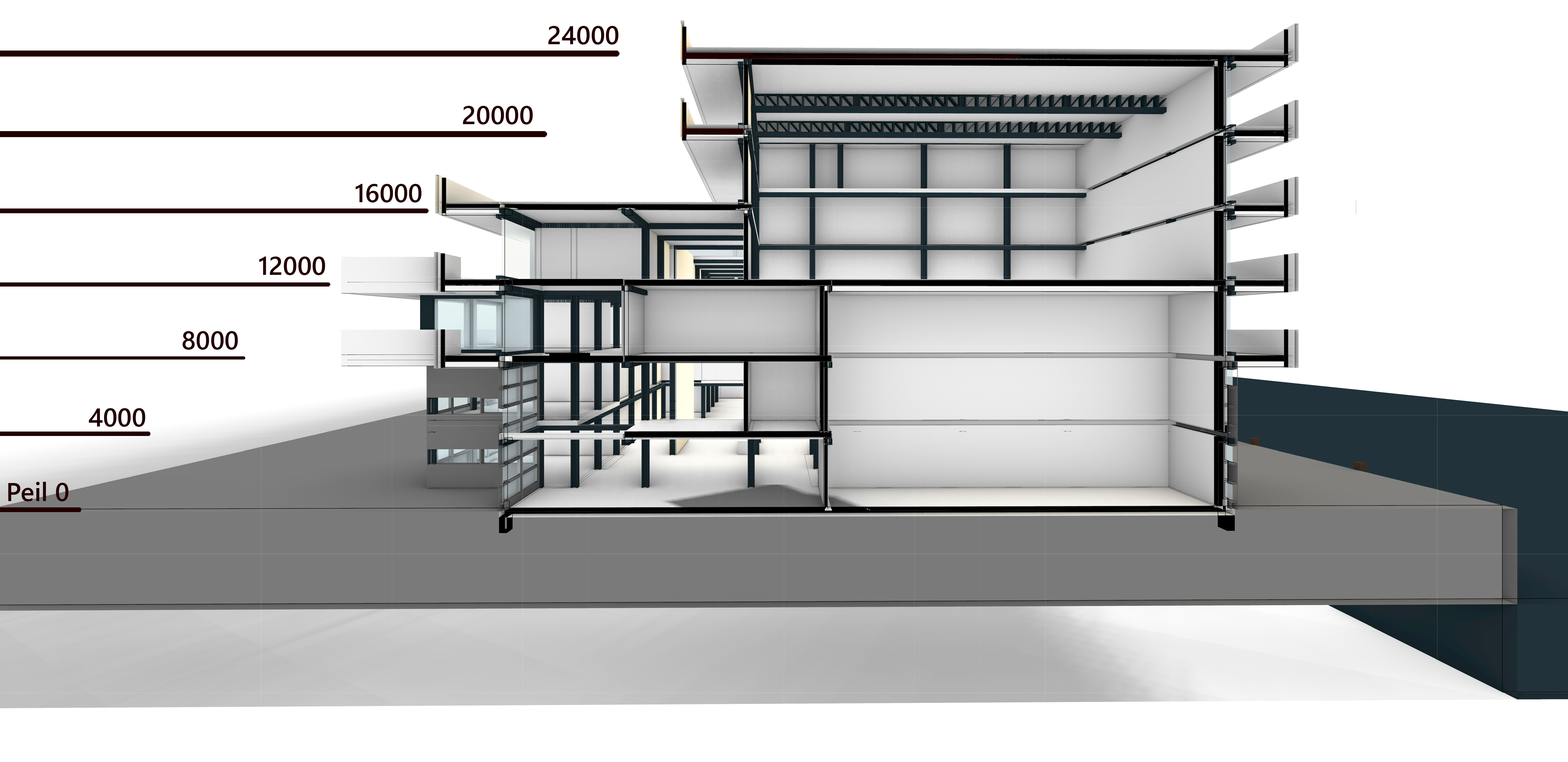 The assignment here was to conduct visual research into the relationship between form and counterform. We did this by setting up an interior space with place-defining, guiding and limiting elements. This allowed new spaces to be created. The masses respectively consisted of predetermined volumes. Before starting the assignment, it was already clear to me that I wanted an extra storey (loft) and a clear dividing line within the unity of my composition. One part of the interior had to be high and relatively enclosed, the other part lower and more open to the outside. In such a way also a boundary was created between some public space and a more private space. Finally, I then started looking at how the choice of tone could enhance the readability of the loft enhance it. Therefore, I chose to give the same objects entirely the same colour give them. To increase the contrast, I placed the black tables relatively close to the open side. The red cabinets against the white walls and put the grey spaces on the white upper space